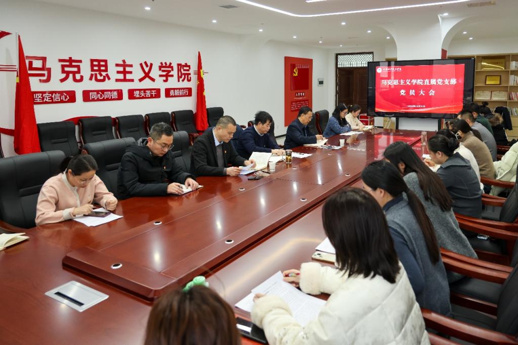 12月31日,马克思主义学院直属党支部在图文信息楼302会议室召开全体党员大会。校党委书记焦洪涛以普通党员身份参会,党委组织部部长包兴祜及马克思主义学院教师共同出席会议。会议由党支部书记黄文伟主持。